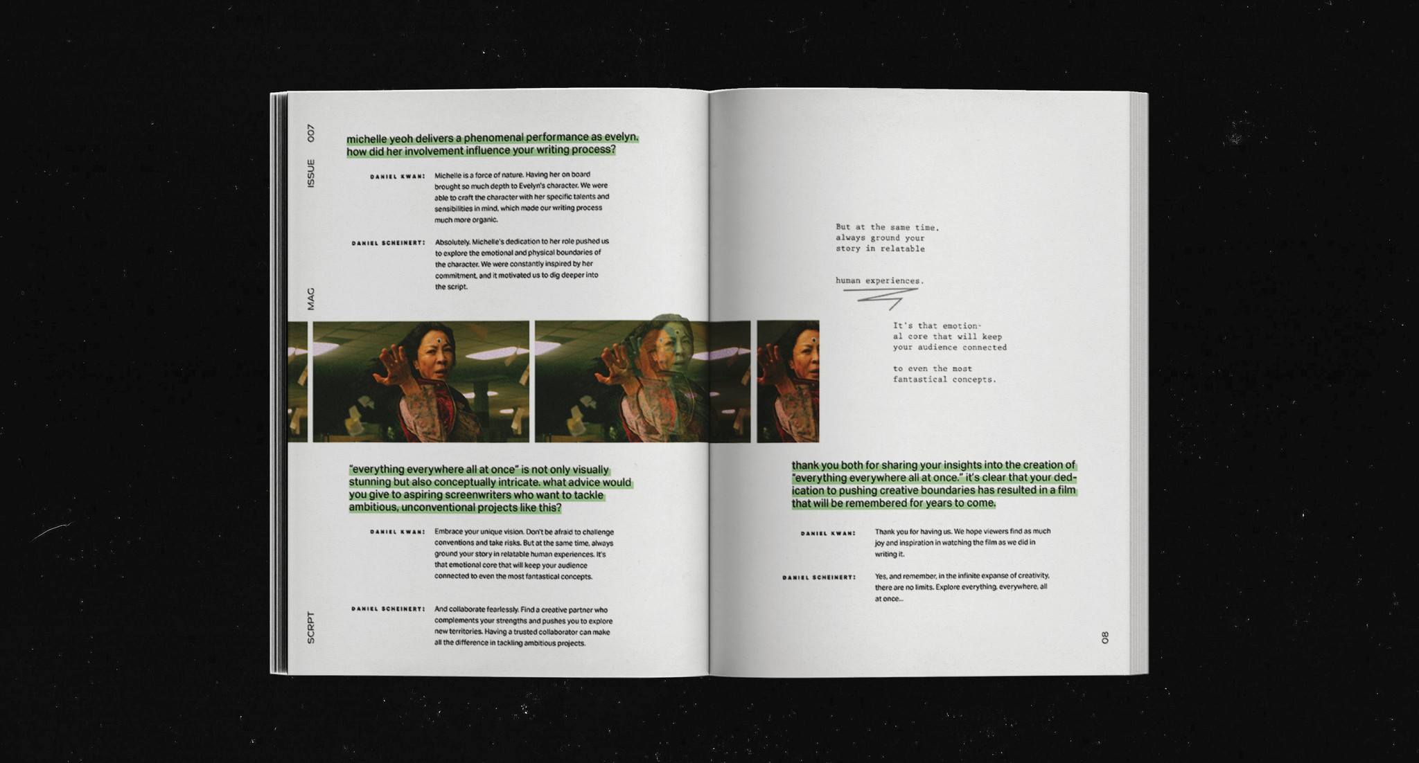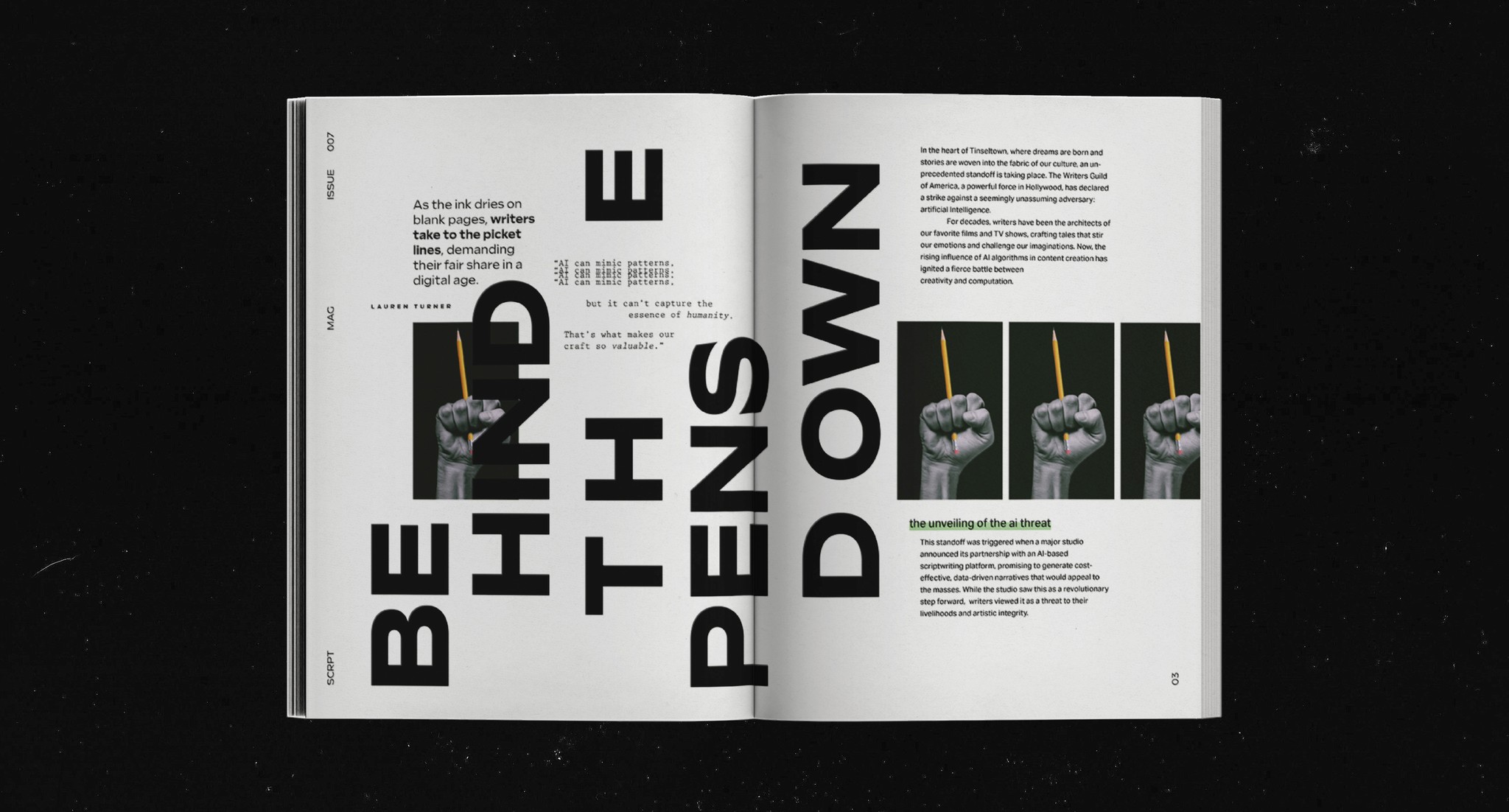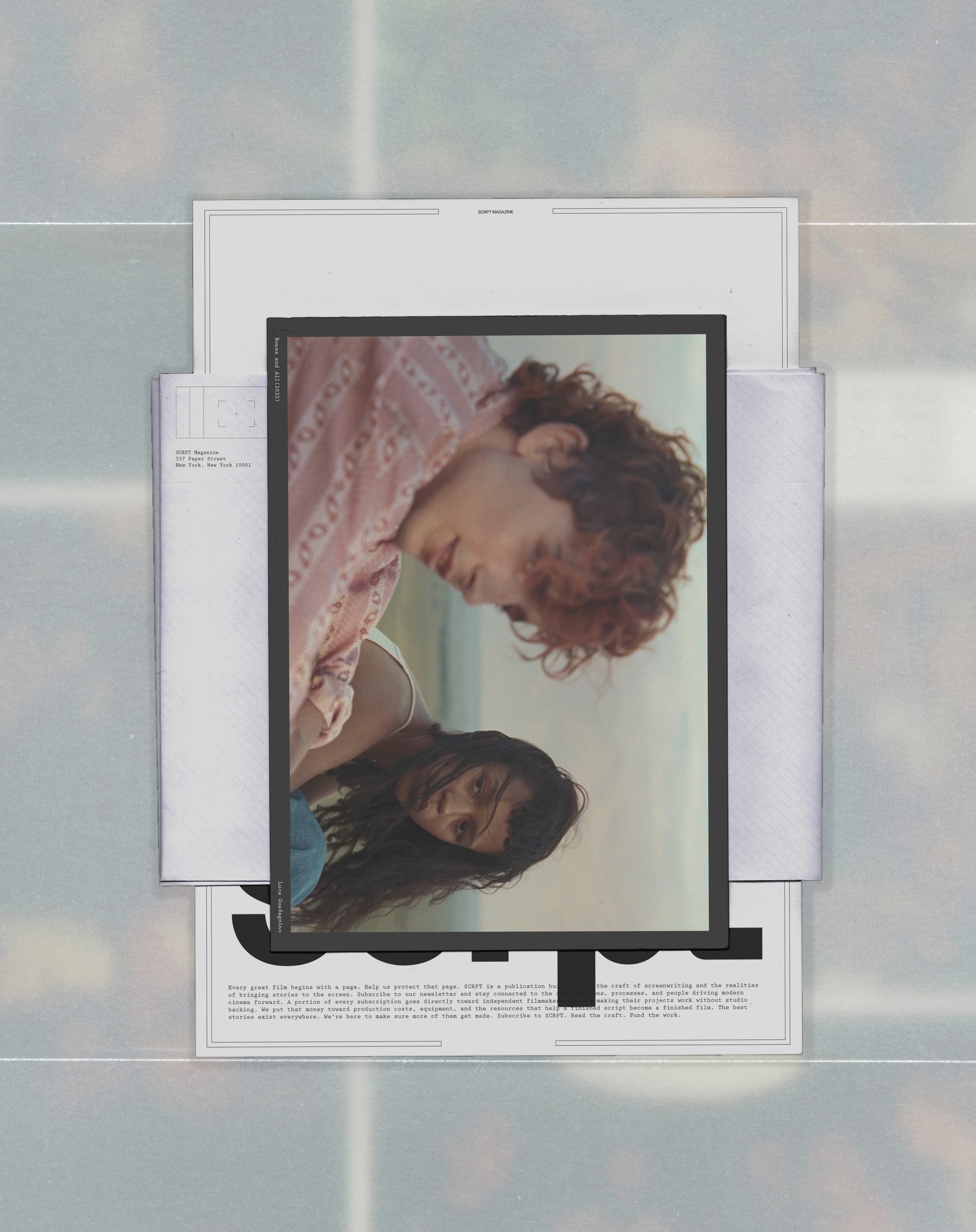 SCRPT is a conceptual publication centered around the world of screenwriting and its adaptation to the modern film world. It aims to spotlight the creative process and challenges that film writers face in their craft through interviews and feature articles, highlighting filmmakers' talent in an age of AI.