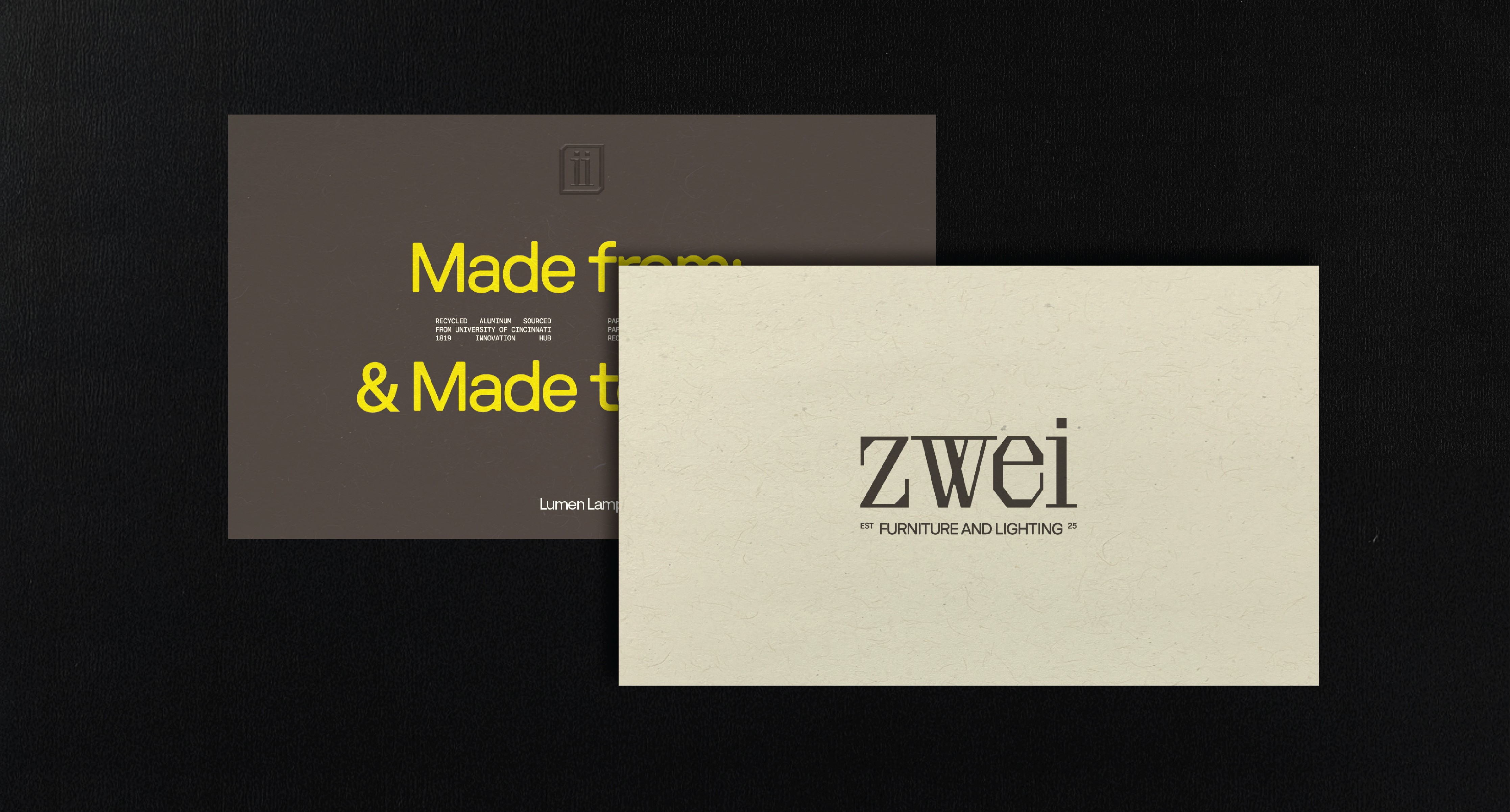 The name is intentional. Zwei means two in German — a nod to second lives, second chances. In collaboration with Garrett Colvin, Marissa Dulay, and Henry Chemero, we built the Lumen Lamp: a fully functioning light fixture made from recycled aluminum and paper fibers. Materials that last, and don't disappear when they're done.